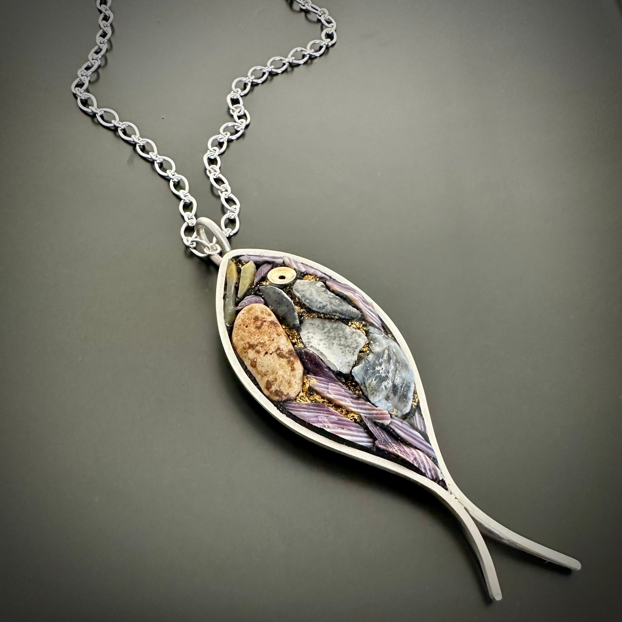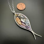 Handcrafted, sterling silver fish shaped bezel is filled with Assateague pebbles and shells. Accented with 24 karat gold leaf. Strong on an 18 inch silver chain. See Penny for scale.