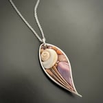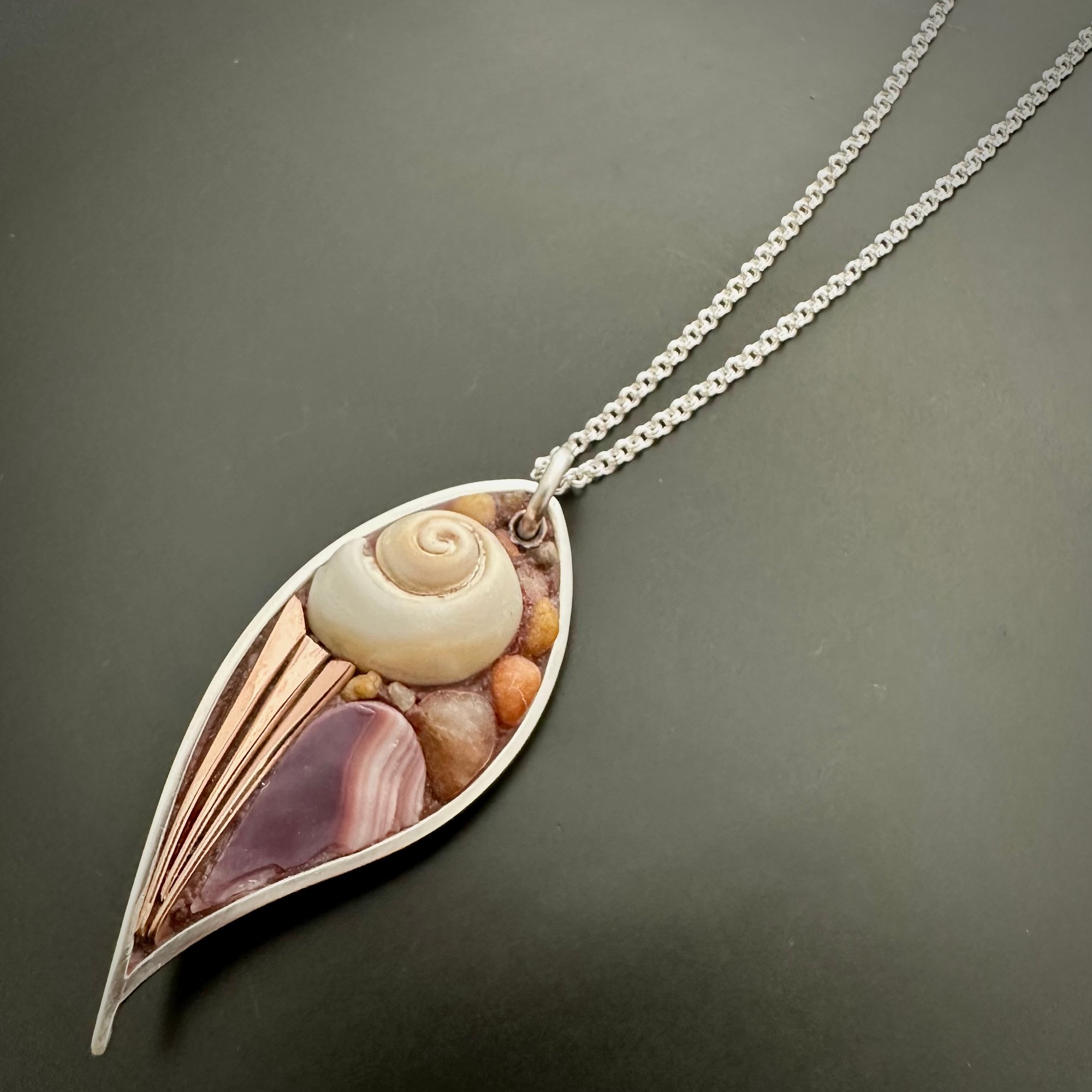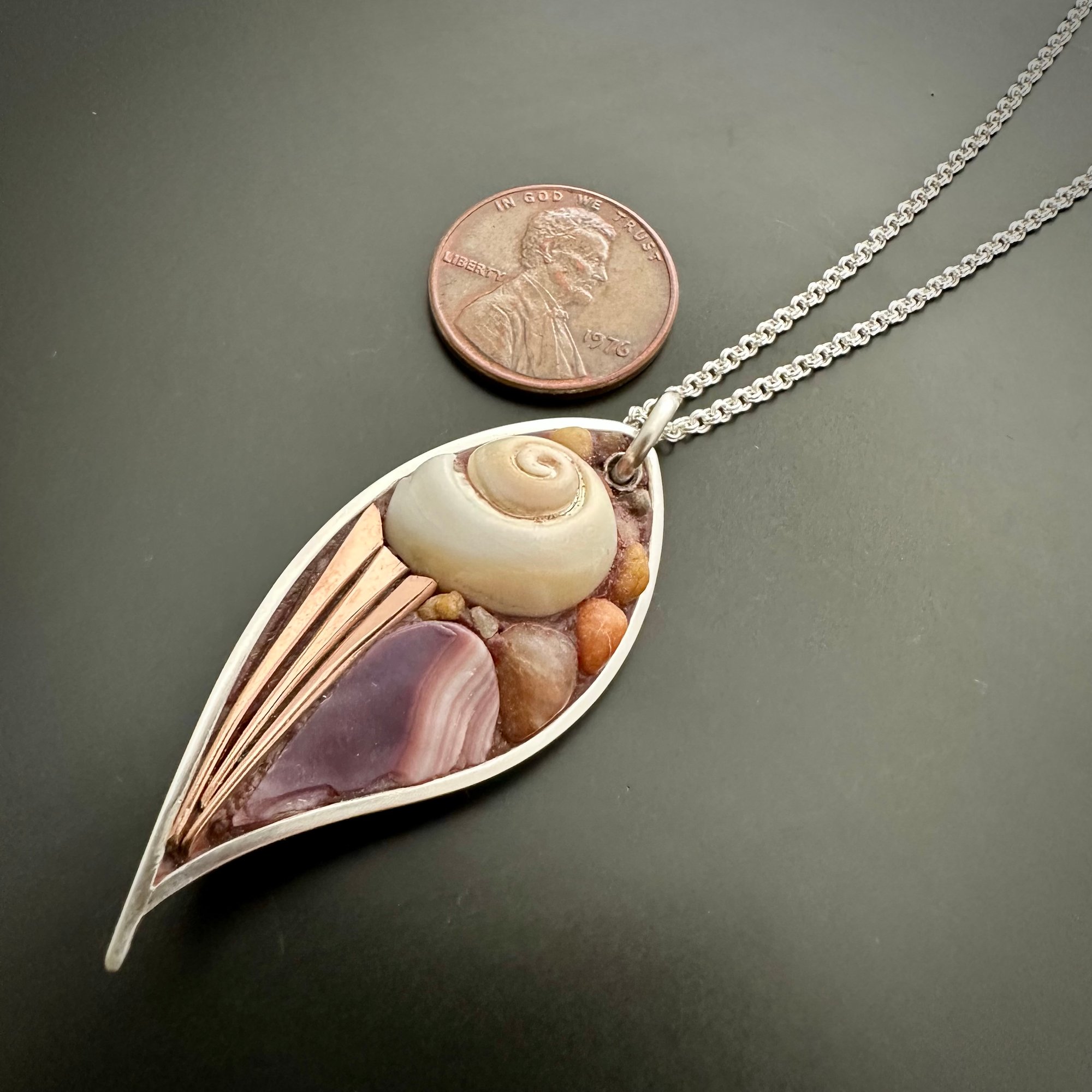 Handcrafted sterling leaf bezel filled with fragments of Assateague shell and rock. Hangs on an 18” Sterling chain with lobster clasp. See penny for scale.