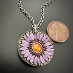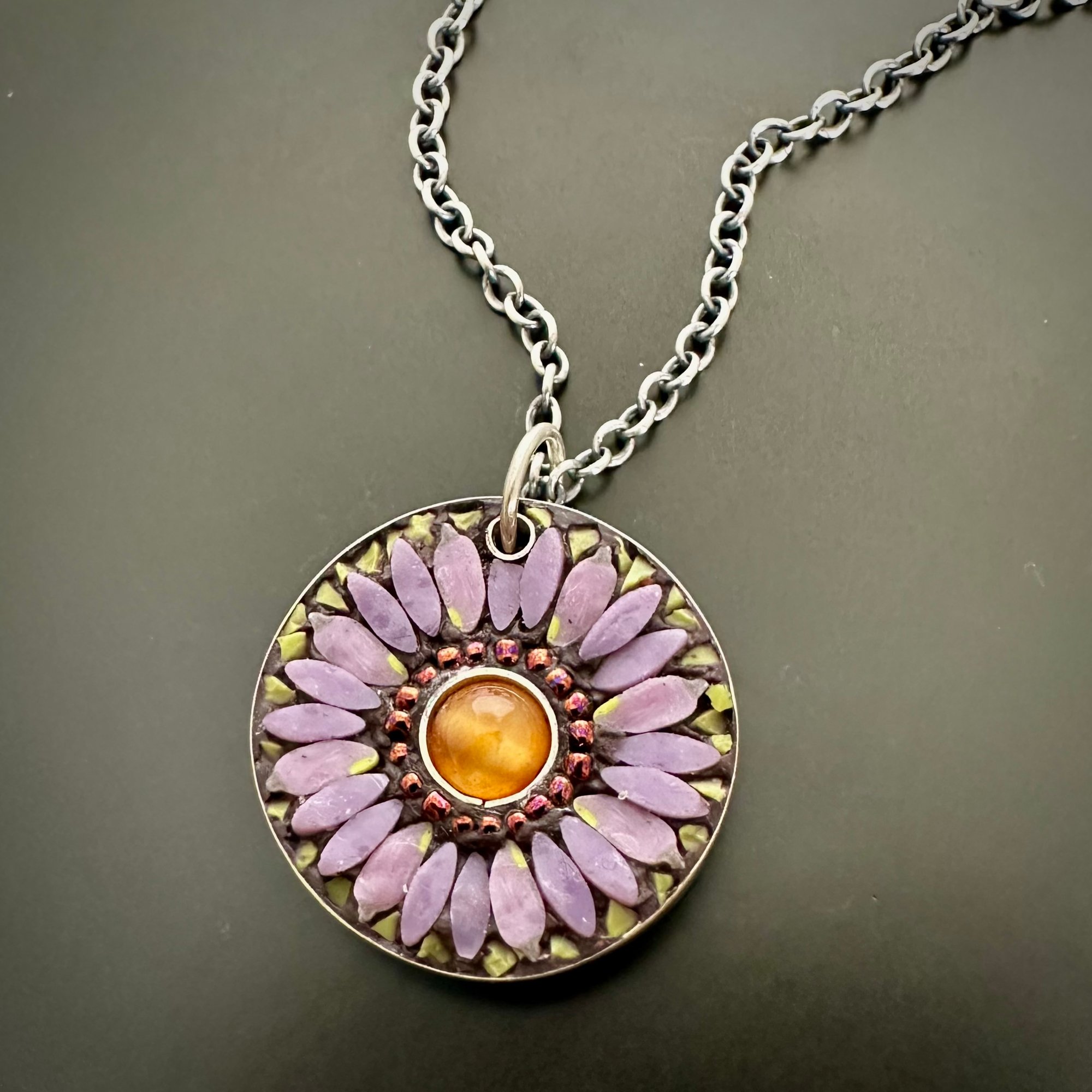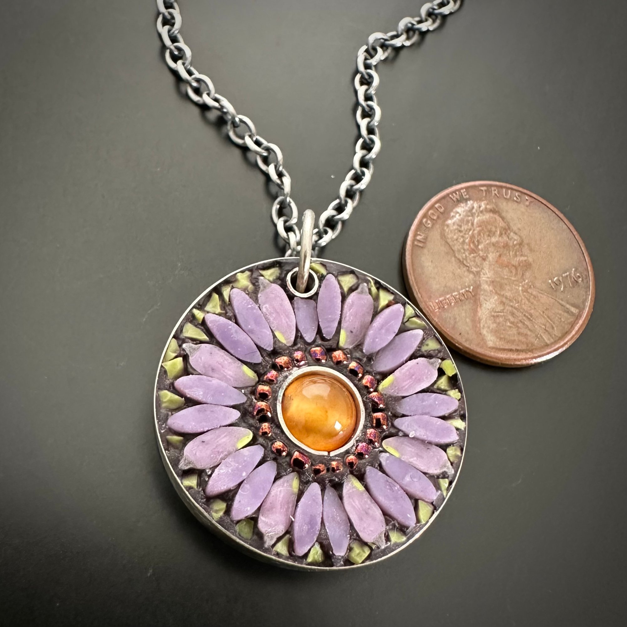 Round, sterling bezel filled with a lovely shade of deep lavender Italian filati. Strung on an 18” sterling chain. See Penny for scale.