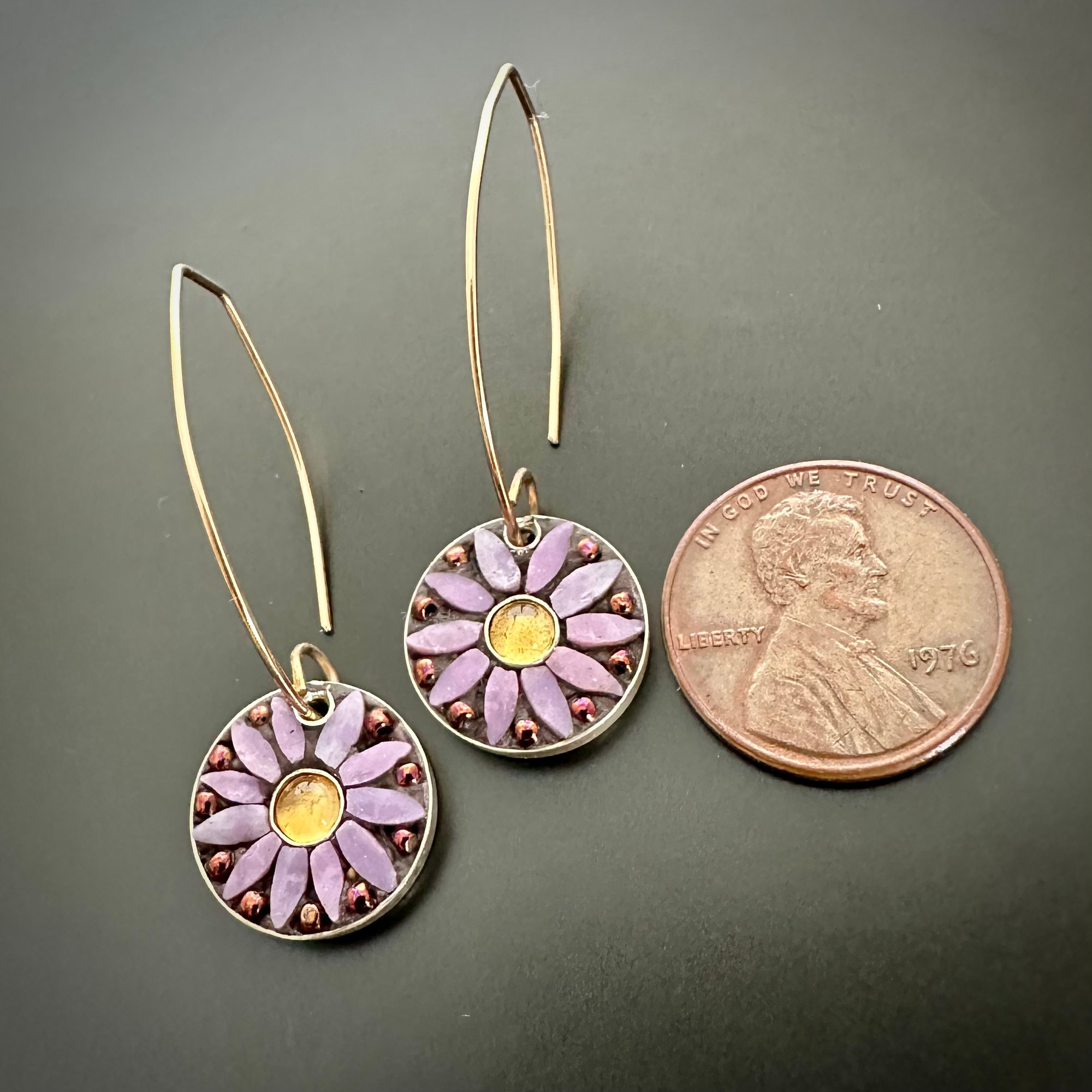 Sterling silver bezels filled with tweezer set Italian glass, accented with bezel set citrines. Hang on 14k yellow gold filled ear wires. See Penny for scale.