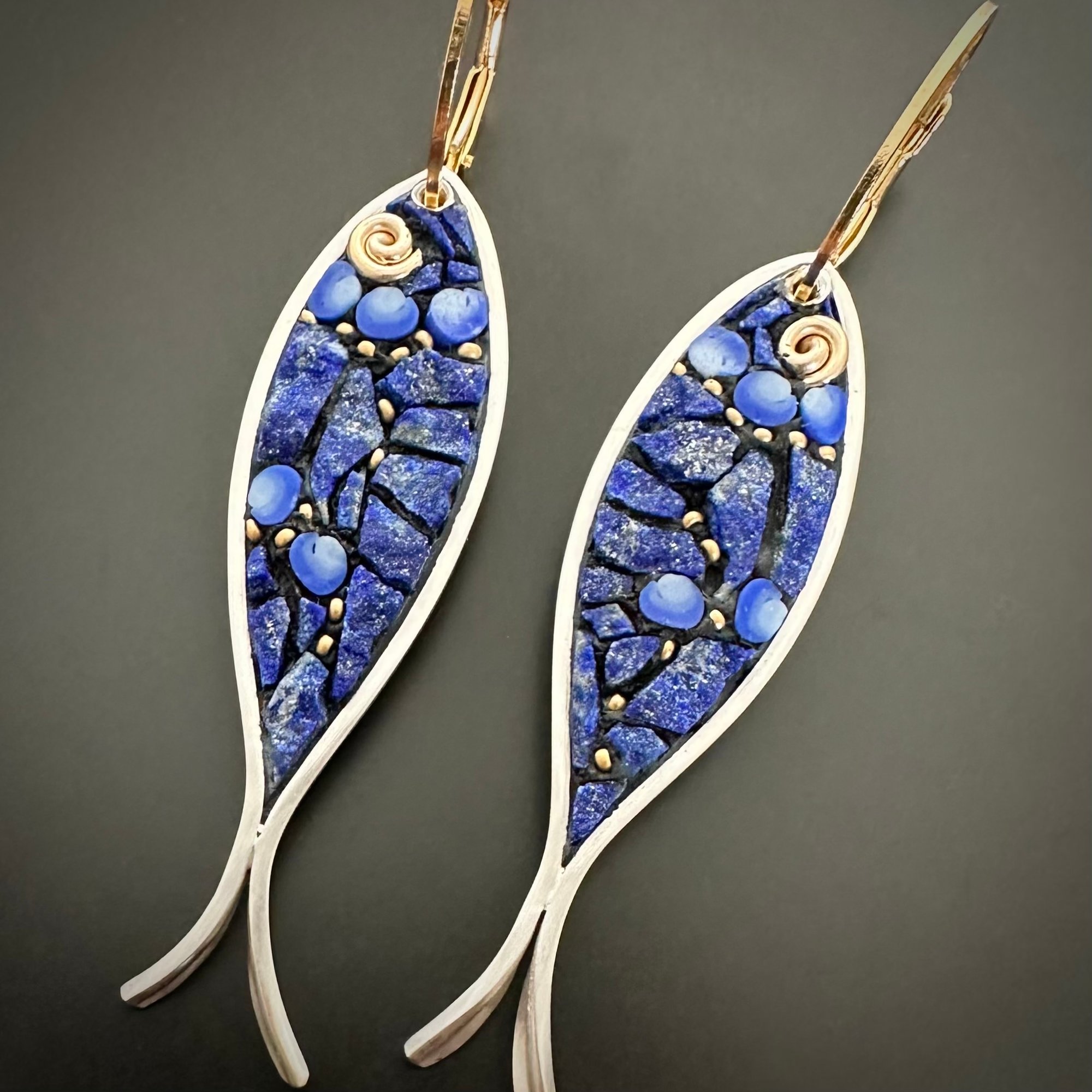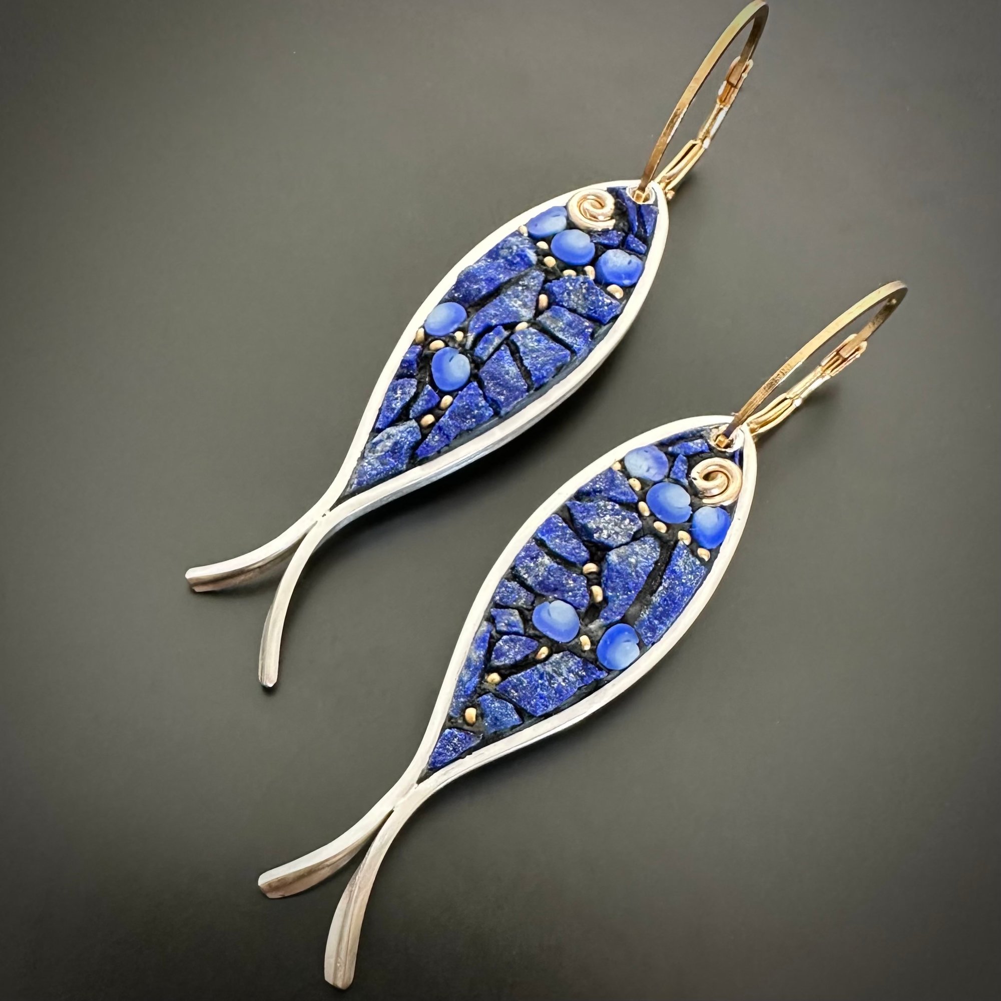 Lapis lazuli and Italian glass combine with 14k gold filled accents in these sterling silver handcrafted fish shaped bezels. Hung on 14k gold filled hoops. See Penny for scale.