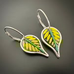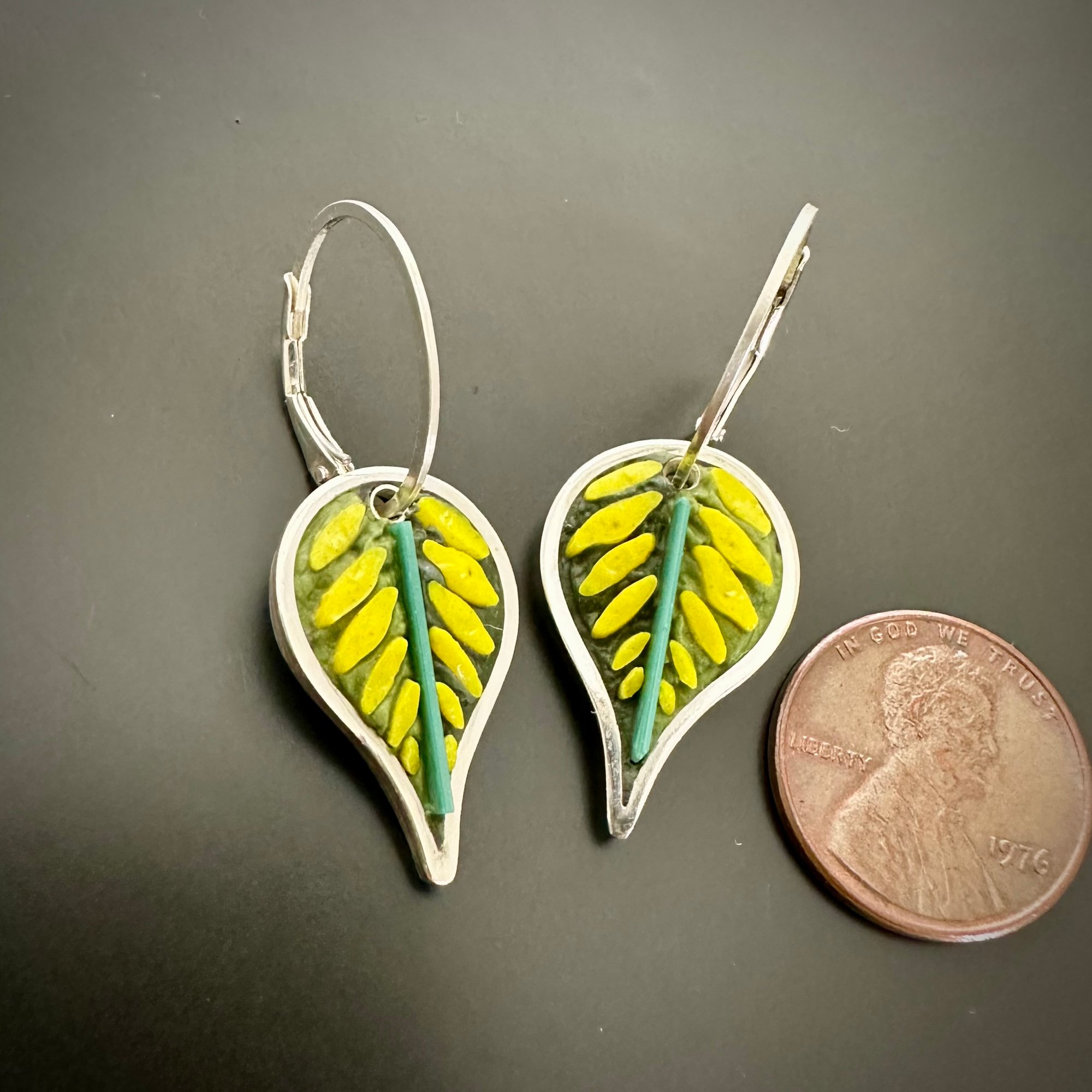 Handcrafted sterling silver leaf bezels set with yellow and green Italian glass. Hung on sterling silver lever back hoops. See Penny for scale.