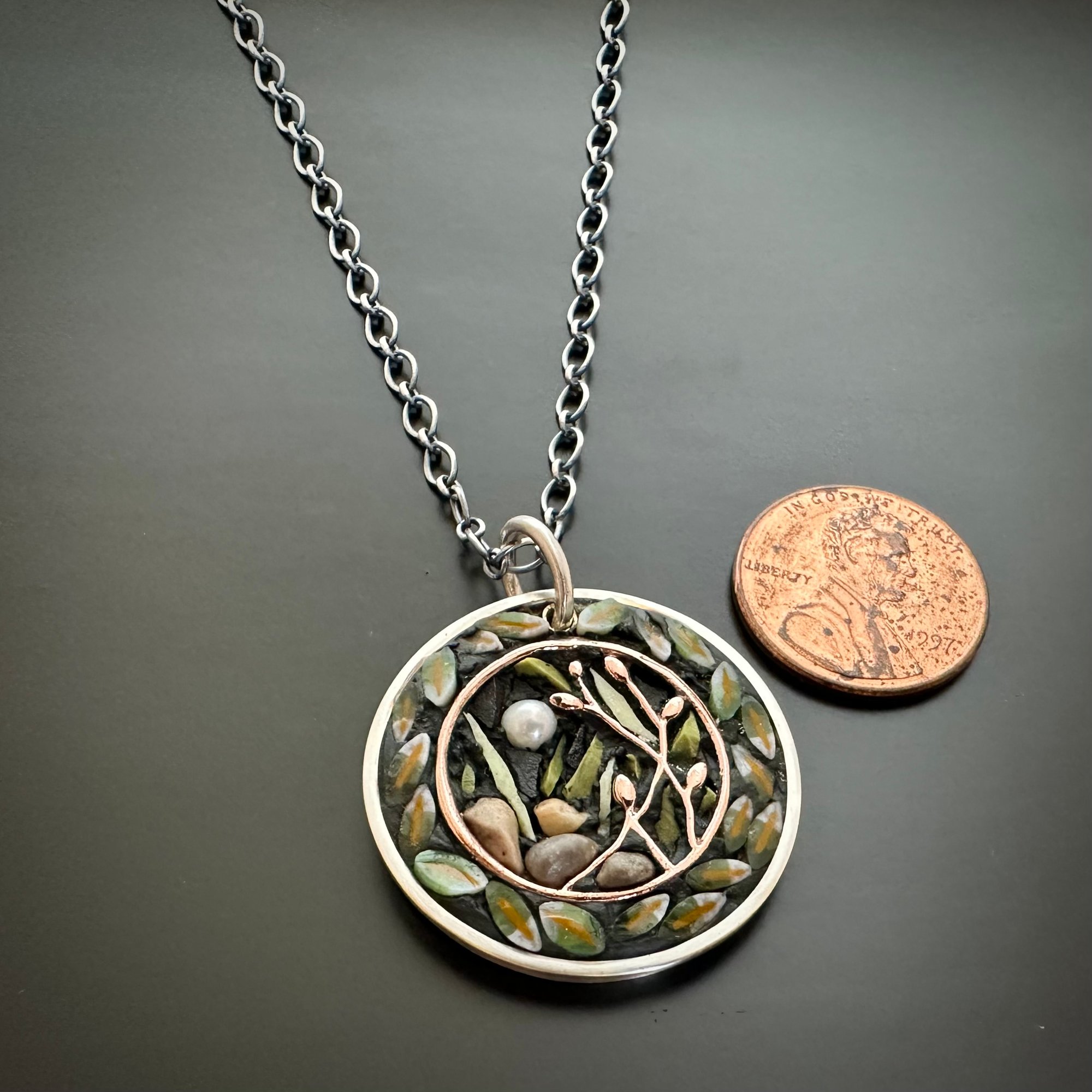 Sterling handcrafted bezel filled with Italian glass, Green Agate , pearl and rose gold filled accents. Chain is 16” See Penny for scale