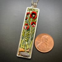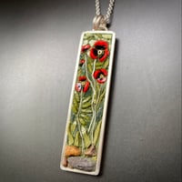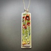 A sweet gathering of poppies grow straight up to the sun. Each Poppy is made from Italian glass filati, accented with a sterling stem; sitting on Ohiopyle river rock. Sterling bezel measures approximately 2 1/4”x 1/2” and is hung on an 18” sterling chain.