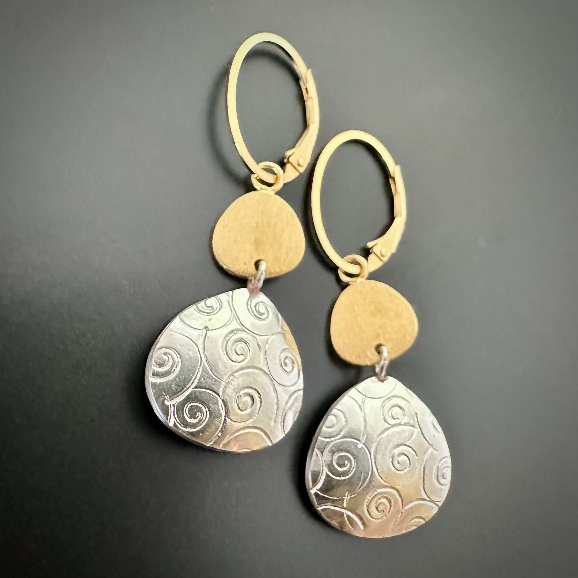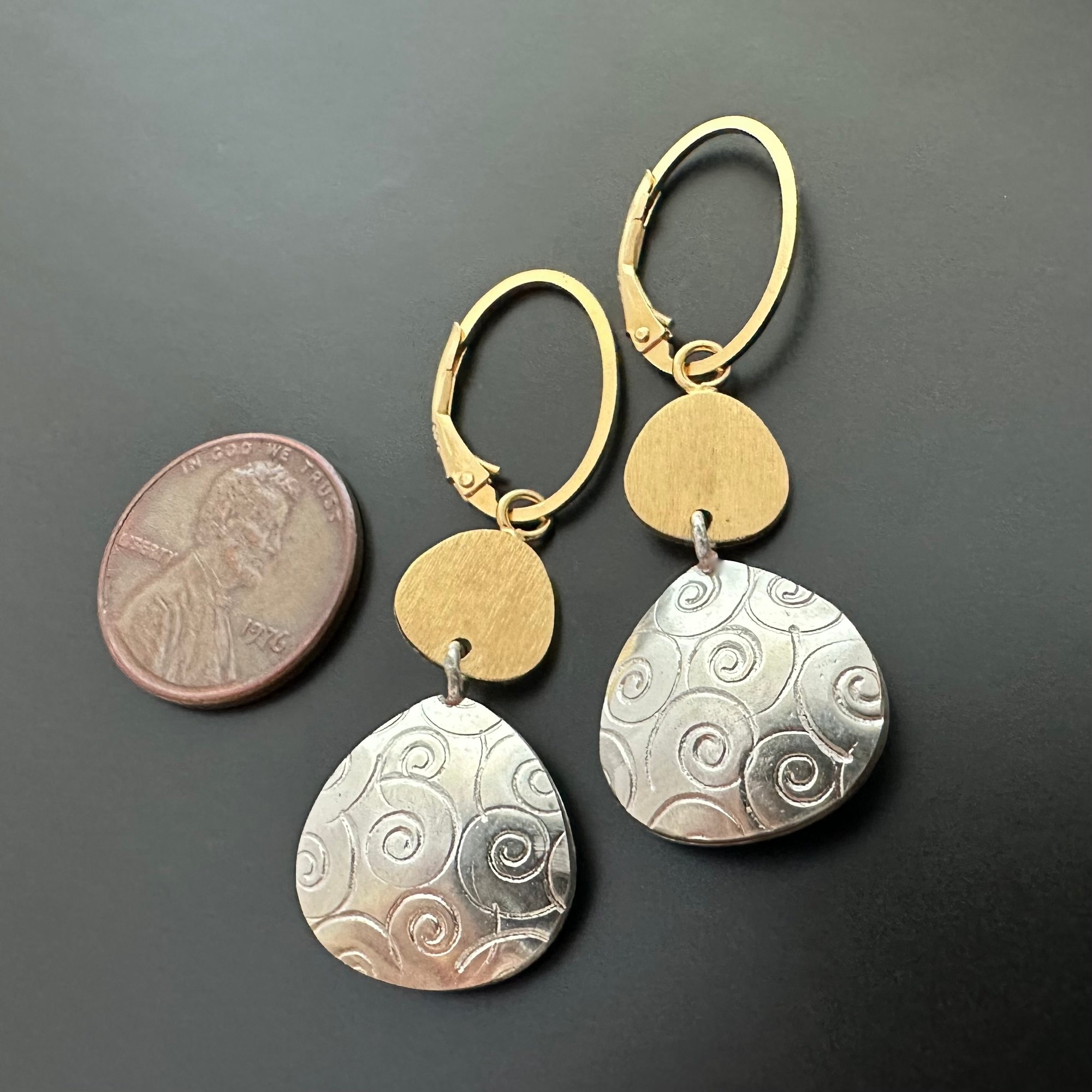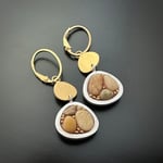 Sterling silver bezels filled with Assateague Island rocks, topped with 14k gold plated pebble. Flipside reverses to an all sterling back with swirl design. Gold filled oval hoops. See Penny for scale.