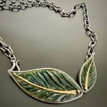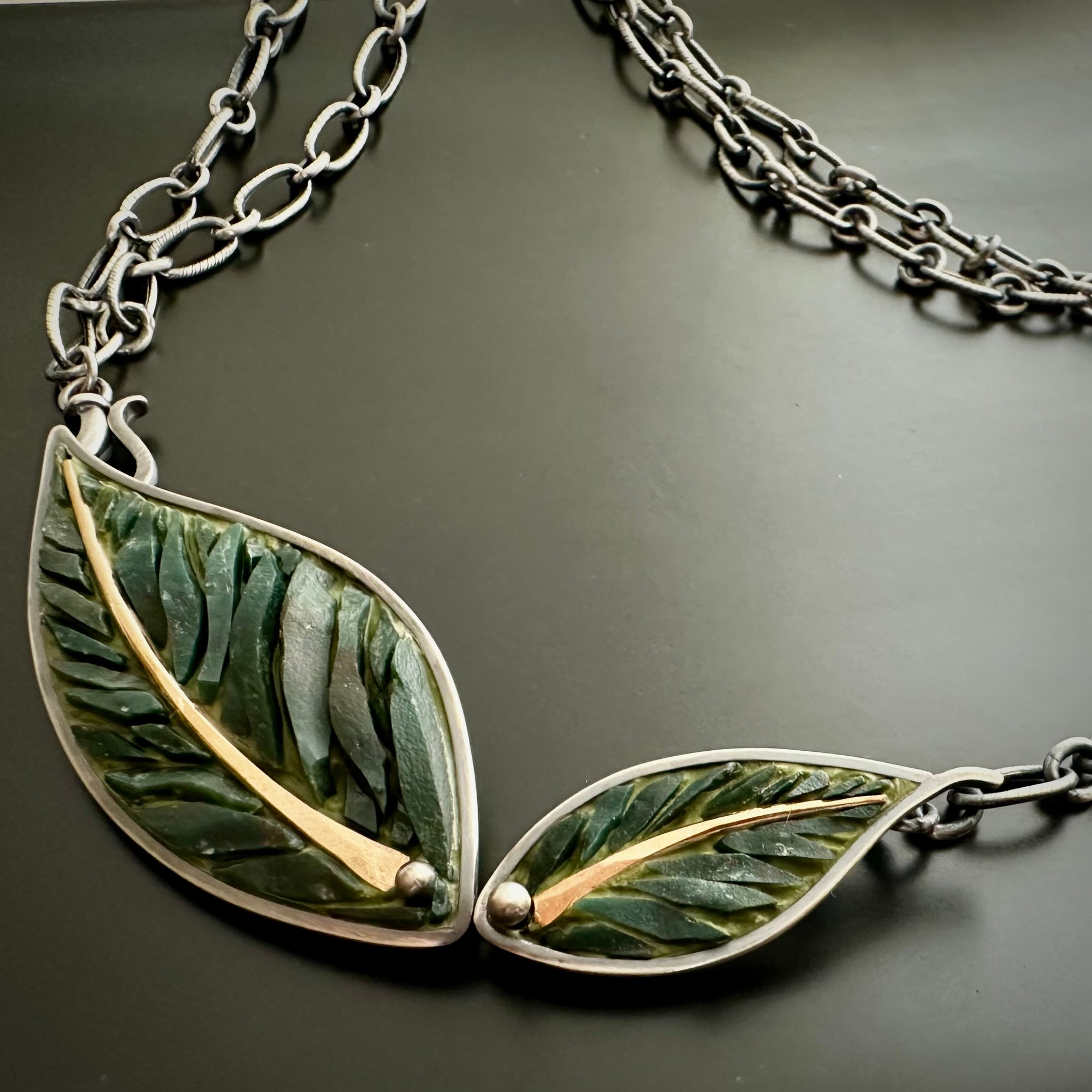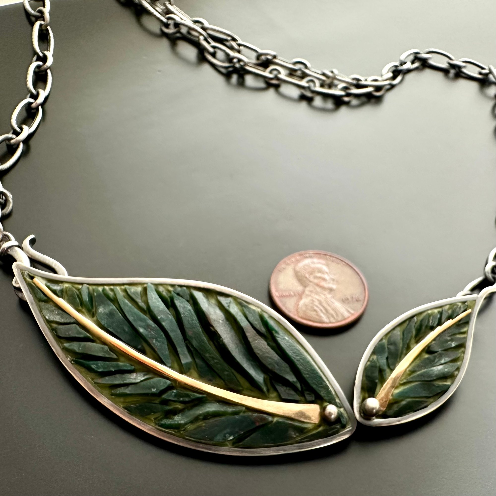 Handcrafted Leaf-shaped bezels accented with dark green Agate and 14k gold filled veining. Sterling chain and hing hook clasp. See Penny for scale