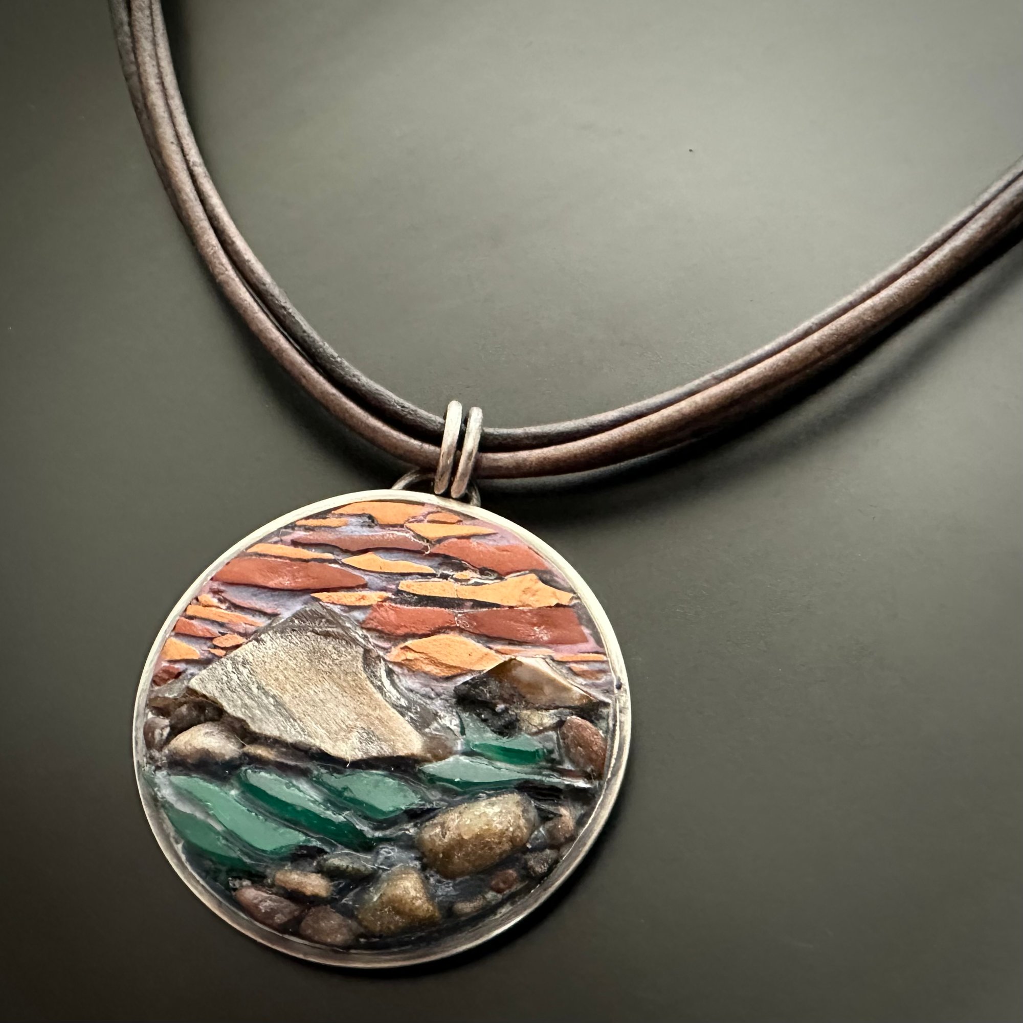 Teton Valley Pebbles sliced by a Green Agate River, accented by a Red Dog sky. Handcrafted sterling bezel hangs on a double leather cord. See Penny for scale.