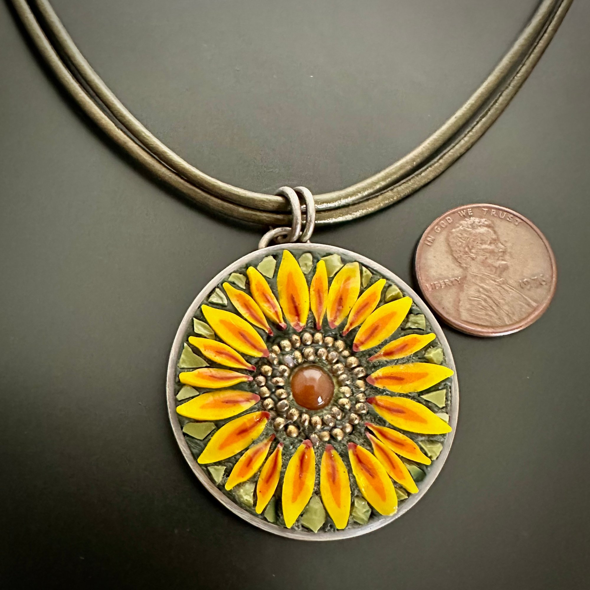 Handcrafted sterling silver bezel is tweezer set with Italian glass and a Carnelian center. Strung on a double leather olive green metallic cord. See Penny for scale.
