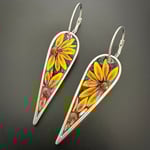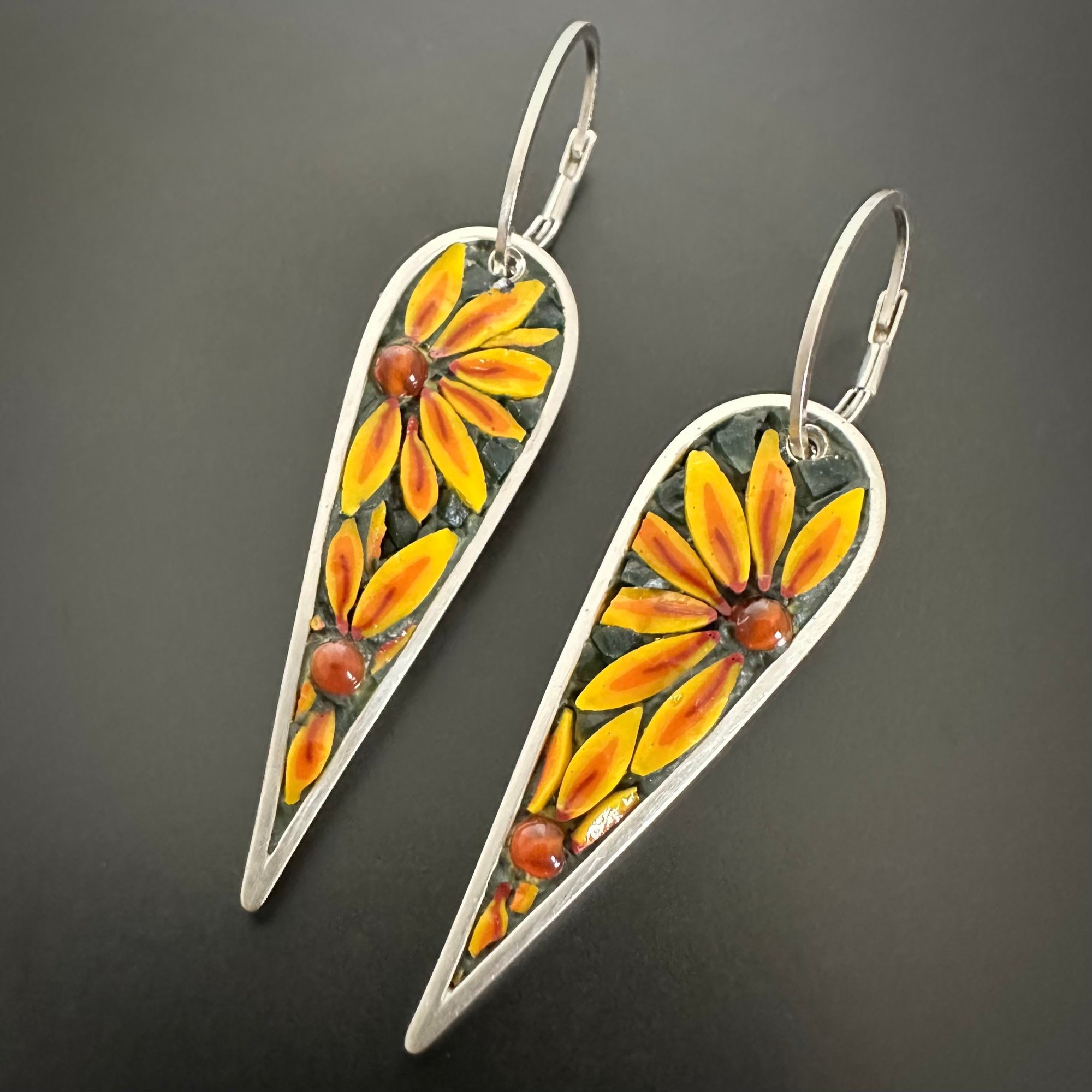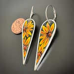 Long, skinny handcrafted, sterling silver leaf bezels filled with Italian glass and Carnelian. Sterling silver hoops. See Penny for scale.