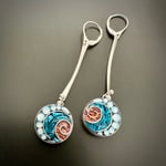 Sterling silver round bezels filled with Italian glass, red dog and sterling swirls. Sterling lever back ear wires.